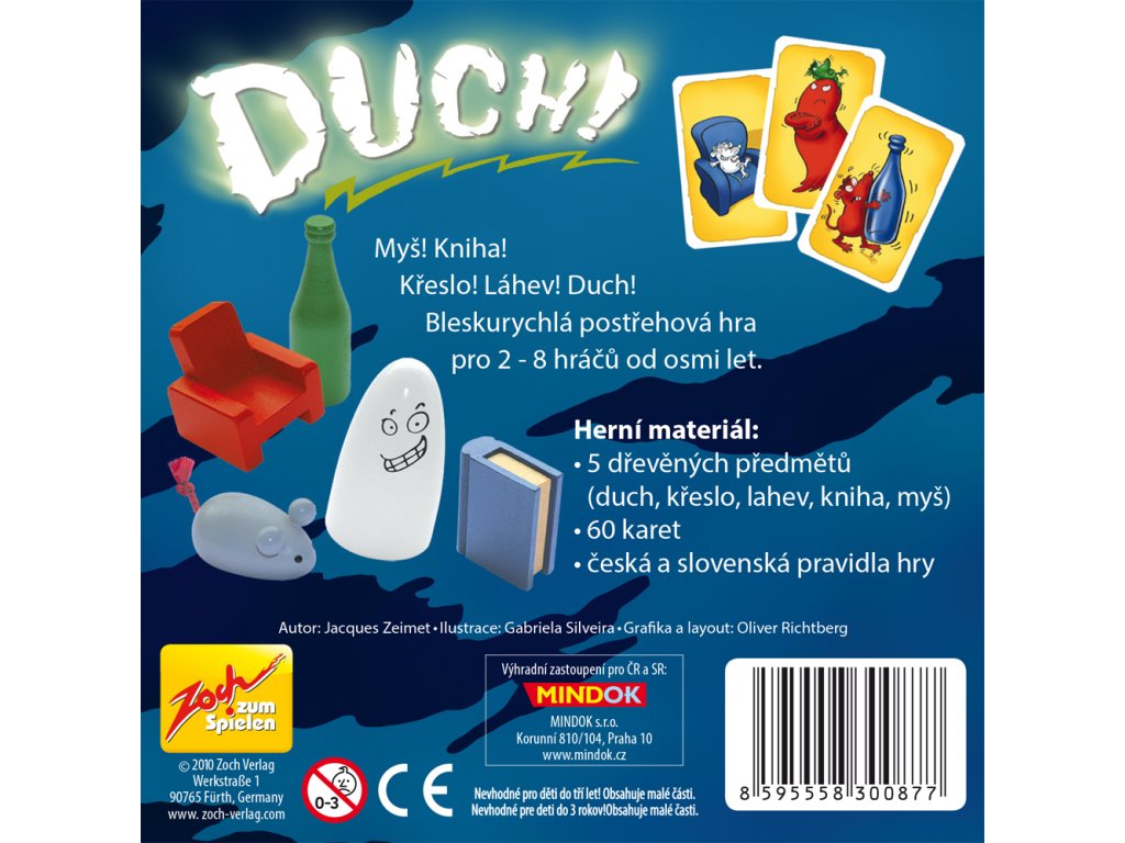 Myš! Kniha! Křeslo! Láhev! Duch! Ve hře je 5 různých dřevěných předmětů – bílý duch, zelená láhev, modrá kniha, červené křeslo a šedá myš. Na kartách jsou obrázky těchto předmětů, ovšem ne vždy ve správných barvách. Hra obsahuje 2 varianty – jednodušší a náročnější. Příklad: Na kartě je modrý duch a červená myš. Ve hře žádný modrý duch, ani červená myš nejsou. Cílem je tedy vzít (zelenou) láhev, protože na kartě není zobrazena ani láhev, ani zelená barva.